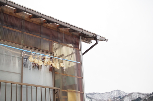 冬の奥会津の民家の軒先にはいろいろなものが吊るされていて、そこからもこの土地を感じることができます。ちなみにこれは、円盤状にしたお餅をワラで括って干しています。こういうものに萌える私。