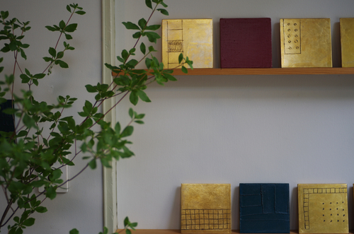 工芸をアートとして楽しむことの面白さ。道具としてではなく、かといって鑑賞するというようなかしこまった感じでもなく、もっと身近なものとして。これからはいろんな素材でどんどんとその選択肢も増えてくるのだと思う。うちではこれを洗面所の脇の壁に掛けています。日々目に付くところであるし、鏡に映ったのが見えるのも好き。箔は真鍮箔で、だんだんとくすんでくるということだったけど少しは変わってきたのかな。こうしてみてもピカピカ感はあまりないから、新品と並べて見てみると一目瞭然なのかも。