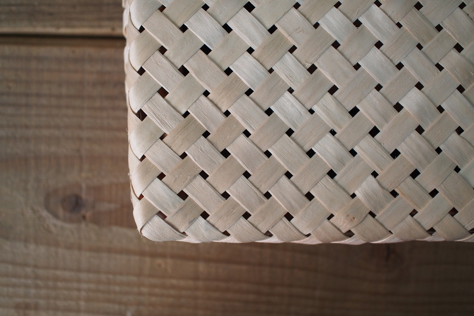材料づくりの大変さとはうらはらになんとも軽やかでやさしい表情のイタヤ細工。ぐっと押しても跳ね返ってくる弾力もその特徴のひとつで、厳しい雪の季節を耐えて育った木々のたくましさと繊細さを持ち合わせた北国らしい手仕事です。