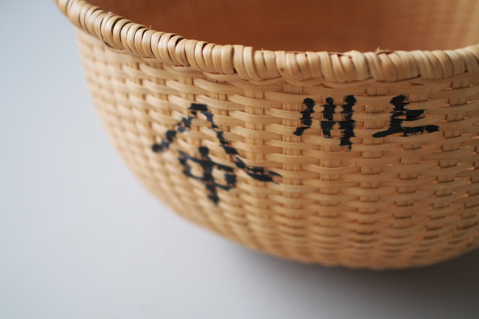 【D】丸くてきれいな形です。縁もしっかり丈夫です、が、屋号が描いてあります。昔は家に集まって作業をすることも多かったので、名入れをするのが普通でした。ドンピシャの川上さん、山中さん、是非!(もちろんそうでない方も)(直径 約35cm・高さ 約19.5cm)※SOLD