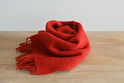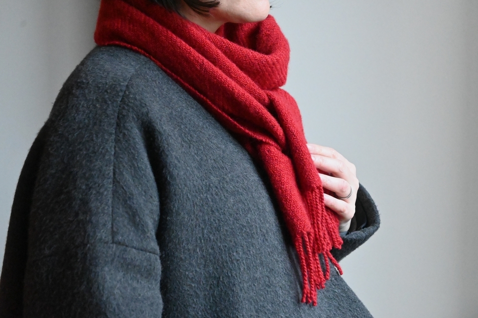 赤いマフラーは、一色のように見えて実はいろいろな赤やそれ以外の色が混ざり合った複雑で深みのある色合い。少しの黒も入っているので全体を落ち着かせてくれています。可愛らしさと上品さと。コーディネートによっていろいろな表情を見せてくれます。女性はもちろん、男性の赤も素敵です。