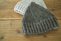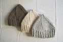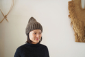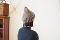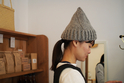 ロービングウールキャップは、素材感を引き立てるプレーンな編地ですが被ると鉛筆の先端のようなとんがりシルエットに。森の小人のような、木の妖精みたいな、どこか愛嬌があるかわいらしい形です。