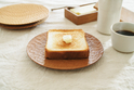 桜の木目、風合いのよさはもちろんですが、機能面でも頼りになるのが木のお皿のよいところ。まずはトーストの命、あのカリッと具合。木がパンの裏側にこもる湿気を吸い取ってトーストの裏がしっとりするのを防いでくれます。削り跡(のみ跡)は意匠的なことだけでなく、表面積を増やし湿気をより吸いやすくするという役割もあるんです。